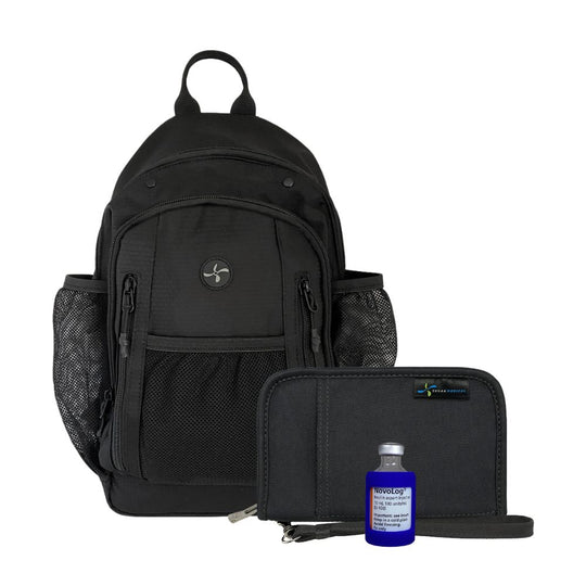 A sleek, all-black collection that combines sophistication with smart diabetes care. This gift set features an insulated sling backpack designed for seamless everyday organization.